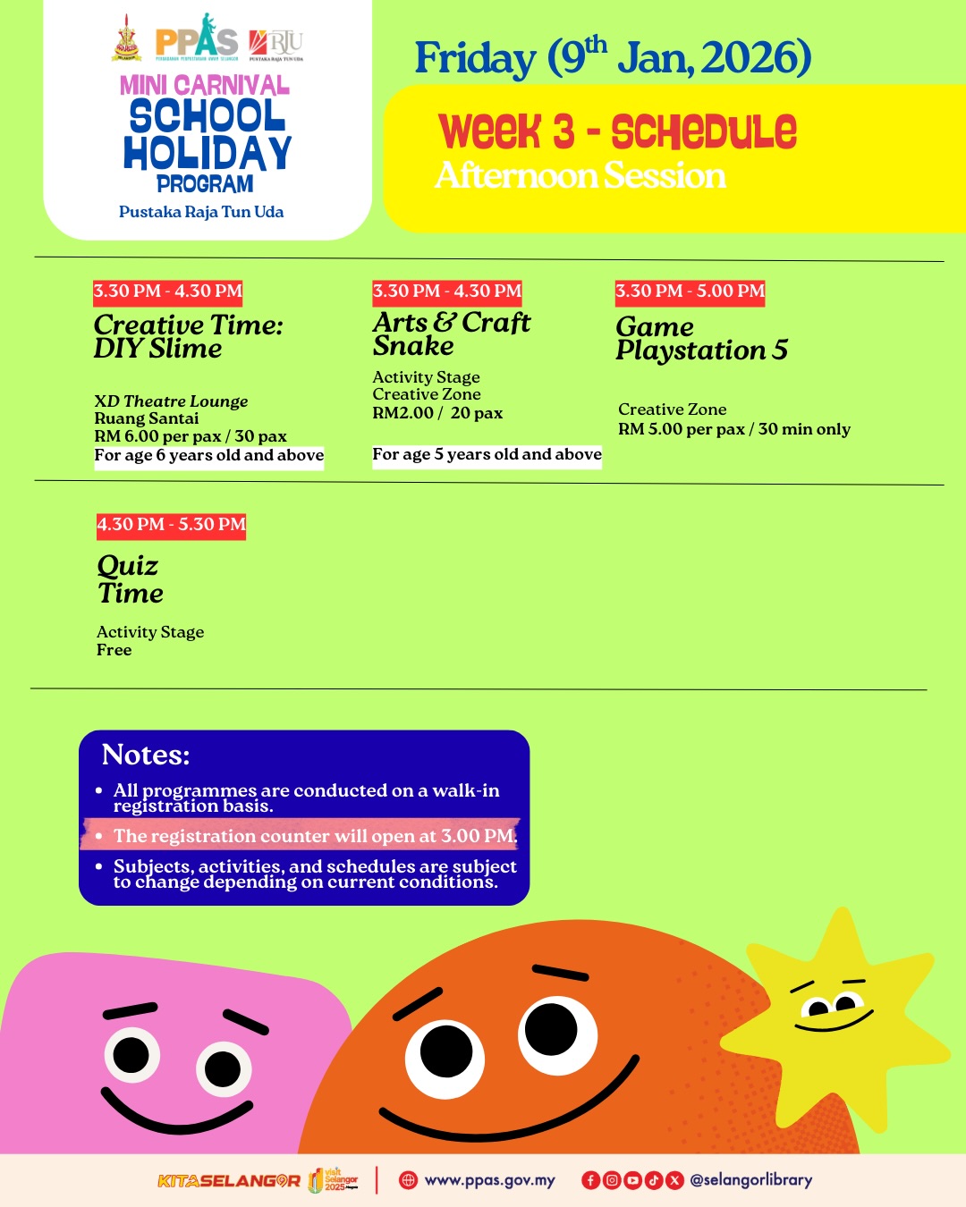 Seperti biasa, program-program menarik diadakan setiap kali musim cuti sekolah bagi mengisi masa lapang anak-anak anda dengan aktiviti yang bermanfaat dan menyeronokkan.